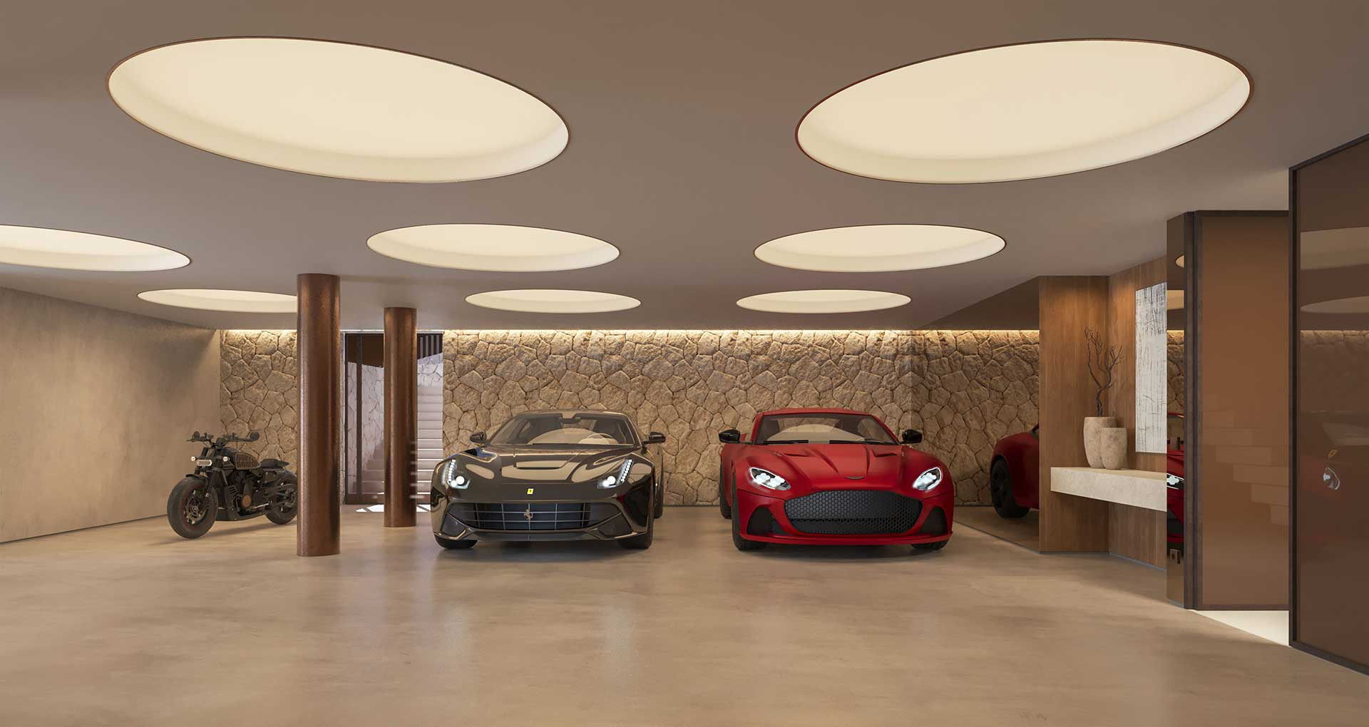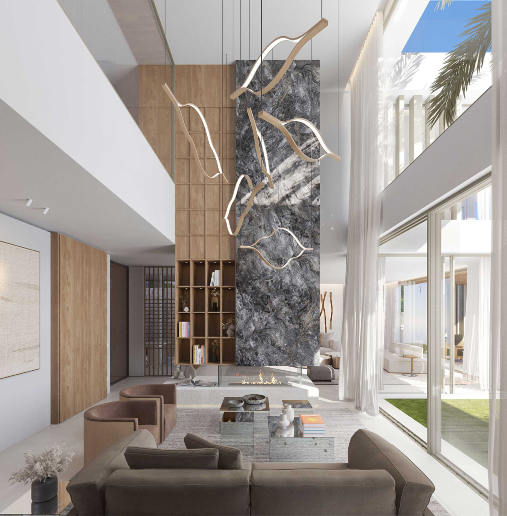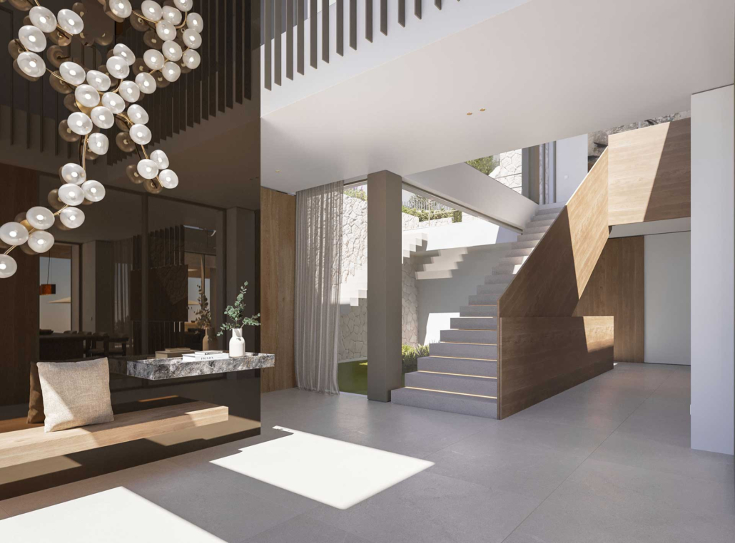 Die Verwendung von Zarzi-Naturstein für die Außenwände, spanische Natursteinplatten für die Terrassenböden und Eichenholzflächen in graphitfarbener Beize verleihen der Villa La Maga einen ausgesprochen exquisiten Materialmix. Besonders beeindruckend ist der großzügige Eingangsbereich mit einem kunstvoll gestalteten Metallgewerk, welches in Kombination mit den weitläufigen Natursteinböden ein außergewöhnliches Arrangement bildet. Dieses detailverliebte Design trägt maßgeblich zur zeitlosen Eleganz und zur besonderen Atmosphäre der Villa bei.