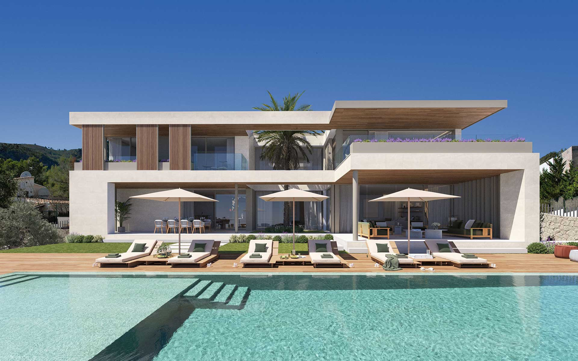 Die Villa ist mit allen Annehmlichkeiten einer außergewöhnlichen Luxusimmobilie ausgestattet – vom privaten Aufzug über die Dachterrasse und den Infinity-Pool mit Grillbereich bis hin zur Fußbodenheizung mit Kühlfunktion. Die intelligente Bauweise und modernste Technologien ermöglichen einen nahezu CO2-neutralen Betrieb, unterstützt durch regenerative Energien. Das alles lässt sich komfortabel über Smart Home Technik steuern.